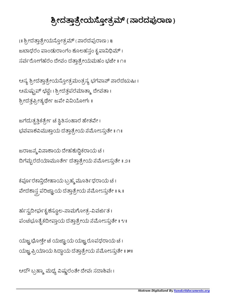 Dattatreya Stotram Kannada - Saluto kalabhairava, il signore della citta di kasi, che brilla come miliardi di soli, che ci aiuta a superare questo miserabile oceano di vita, che e supremo e ha il collo blu, che ha tre occhi e ci concede i nostri desideri, che e la morte del dio della morte, che.